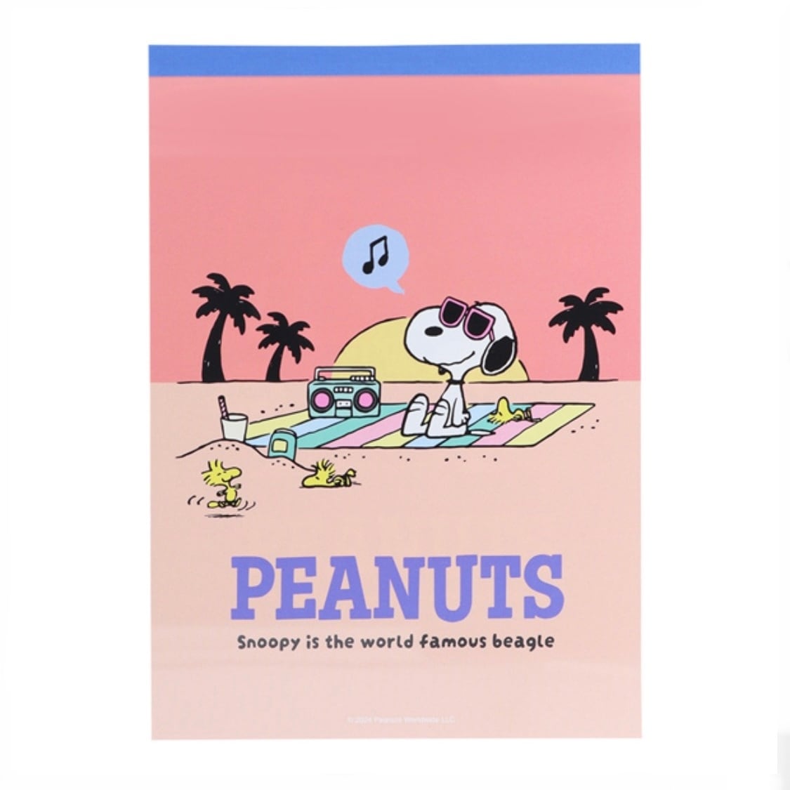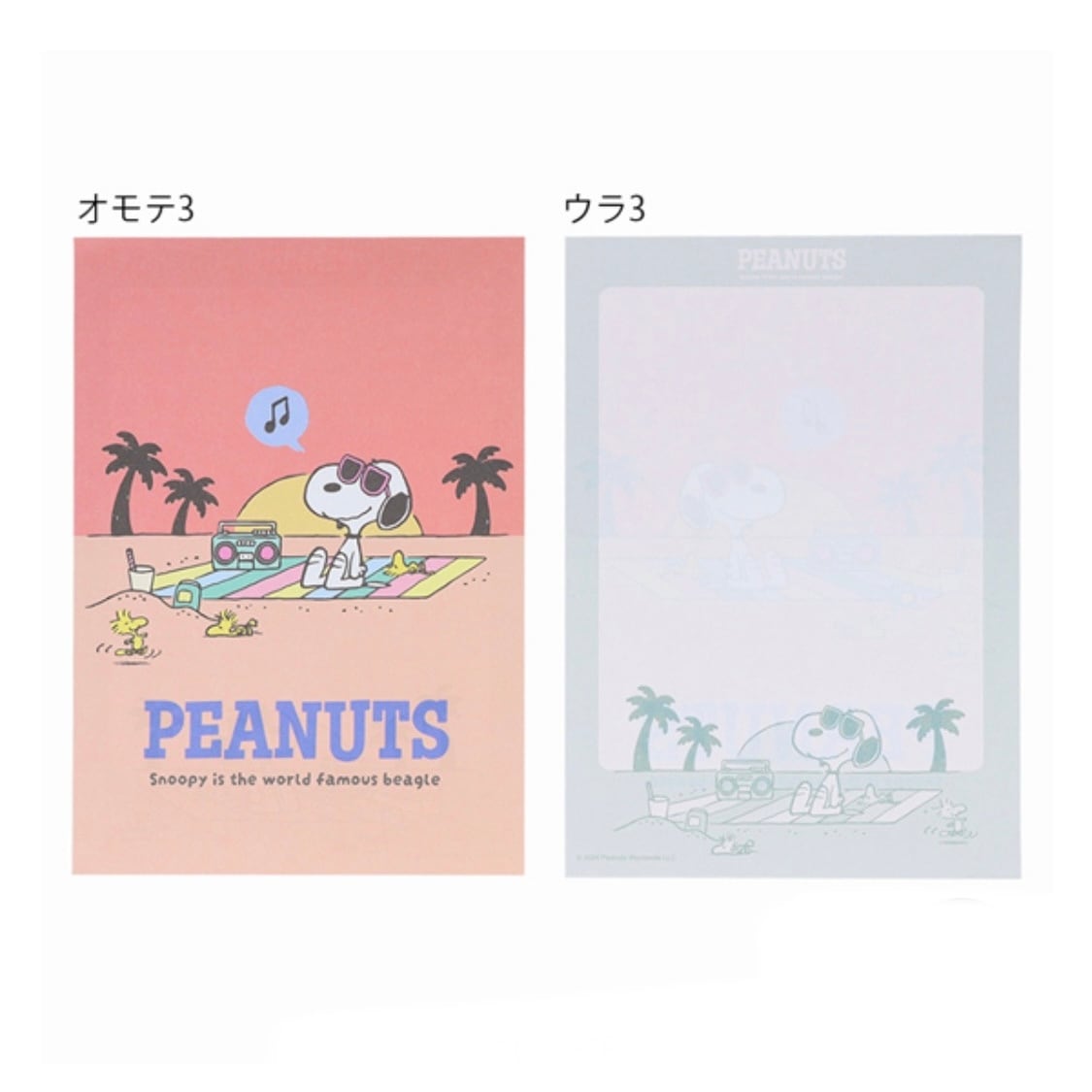 かわいいスヌーピーがビーチでリラックスしているデザインのメモ帳です。